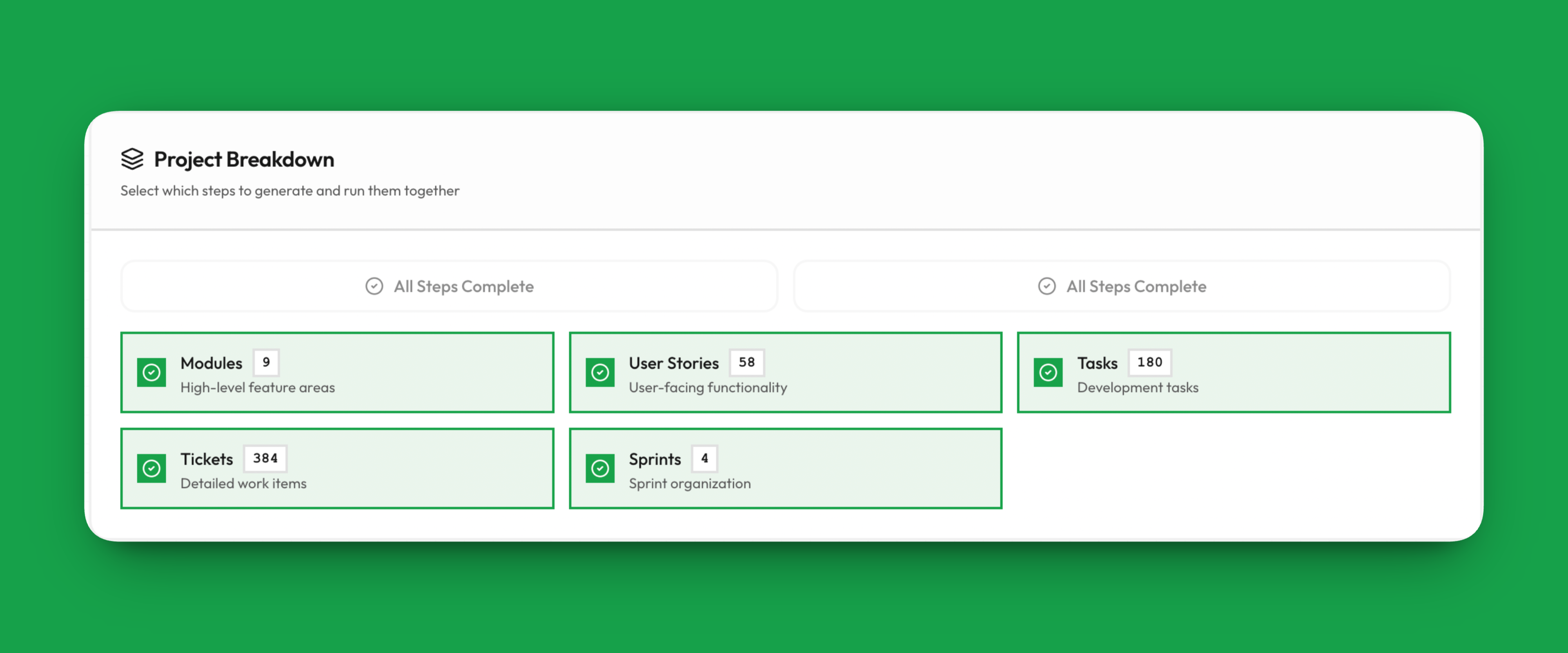 Get a complete breakdown into modules, user stories, tasks, tickets, and sprints. All generated from your brief in minutes.